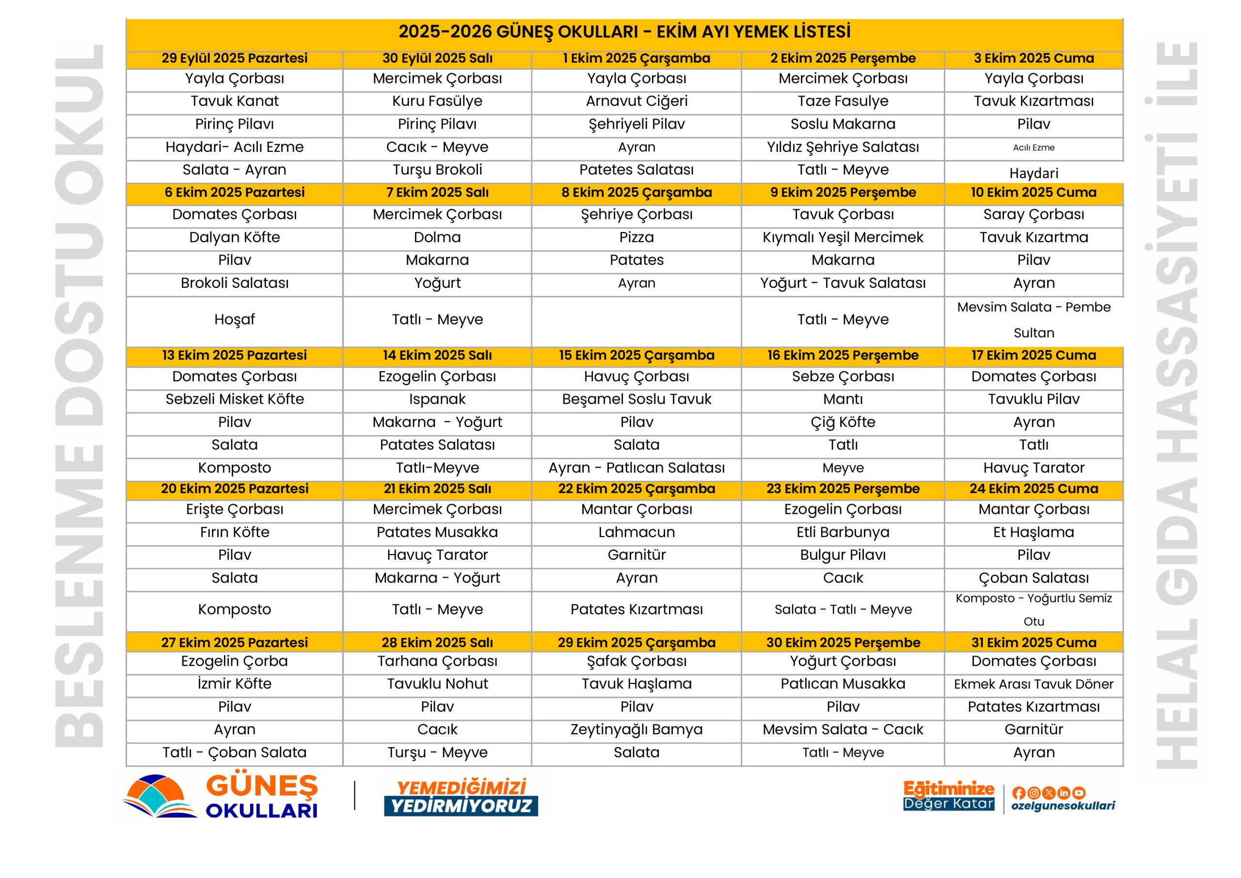Güneş Okulları Ekim Ayı Yemek Menüsü